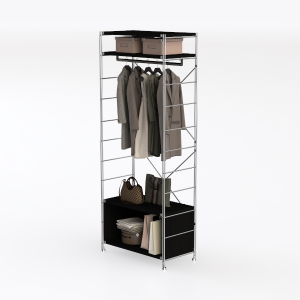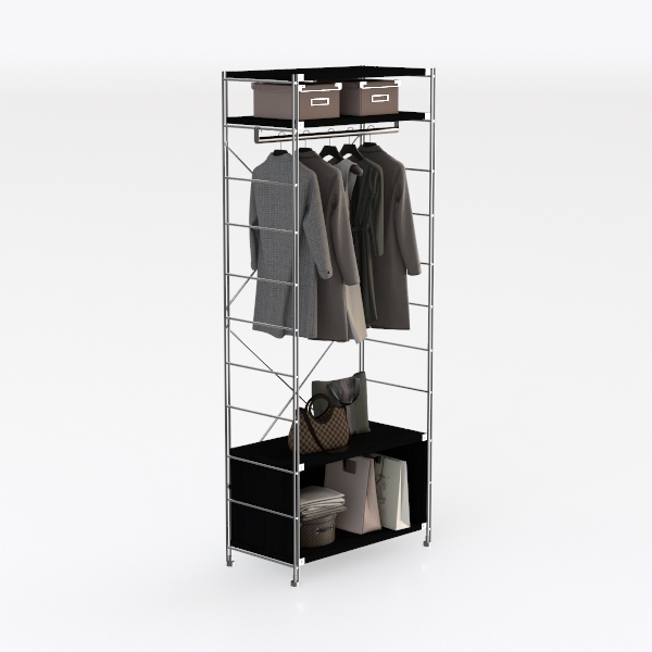 Inspired by minimalist space efficiency, this metal-frame clothes rack blends sleek functionality with modern aesthetics. Its polished metal frame and matte black shelves offer a clean, structured look, while soft fabric and leather bags add subtle texture. Ideal for compact apartments or bedrooms, it pairs well with industrial or Scandinavian decor, featuring hanging rods, upper storage boxes, and lower shelves for organized essentials.