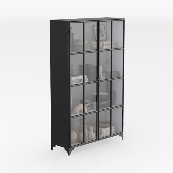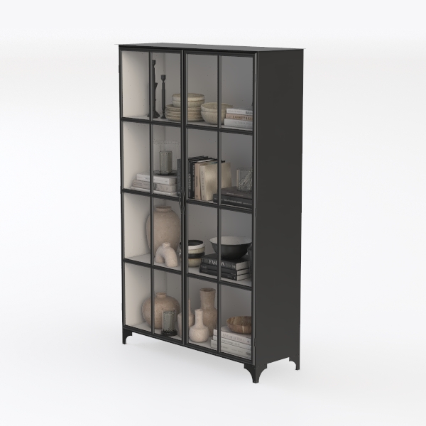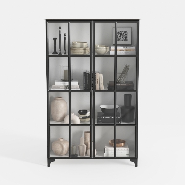 Inspired by industrial-era display cases, this elegant storage unit blends sleek black metal frames with clear glass doors to showcase cherished items. Its clean lines and neutral interior—soft ceramics, textured books, minimalist decor—create warm, sophisticated appeal, with every piece thoughtfully arranged. Ideal for modern, industrial, or Scandinavian living rooms, pairing beautifully with wooden tables and matte black accents. Well-spaced shelves and transparent doors offer practical storage and eye-catching display, balancing function and charm.