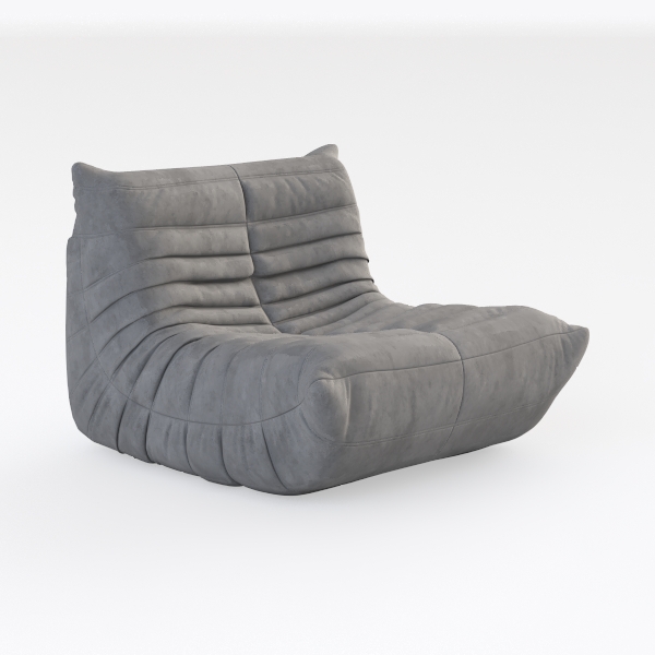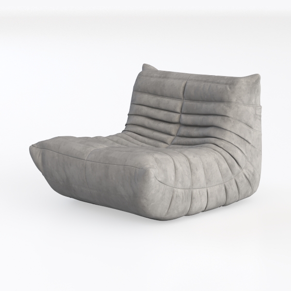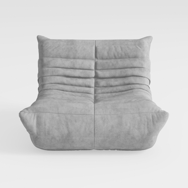 The textured, suede-like upholstery feels surprisingly plush to the touch, with vertical ridges running across the backrest and seat that create depth without overwhelming the eye. Its muted gray hue—neither too light nor too dark—blends seamlessly into various color palettes, adding a calm, sophisticated energy to any space. The overall silhouette, with its slightly rounded edges and soft, billowy shape, feels both modern and timeless, as if it could anchor a retro-inspired lounge or elevate a sleek contemporary living area.