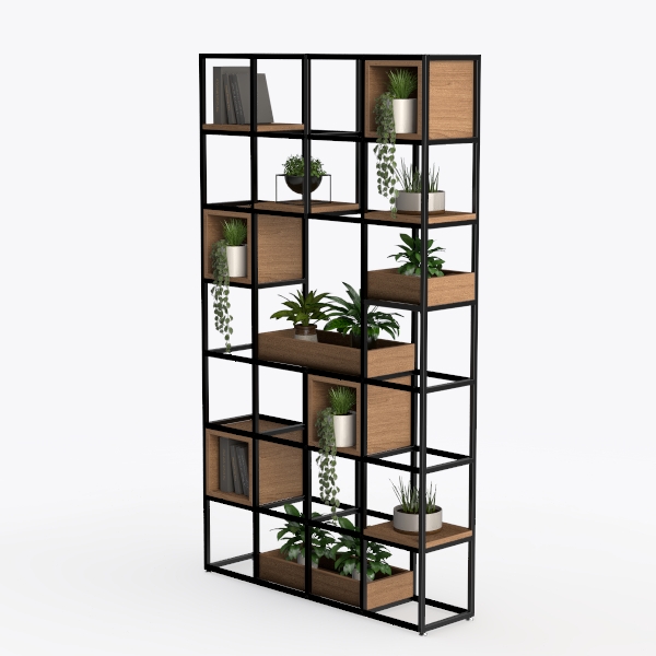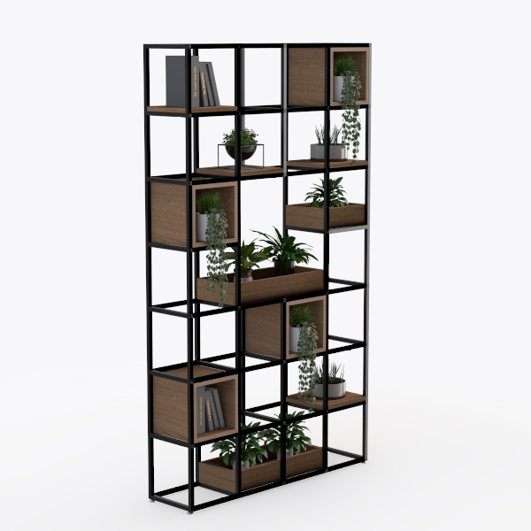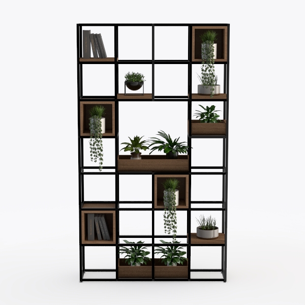 Inspired by urban green oases, this shelving unit merges sleek black metal frames with warm wooden shelves, balancing cool sturdiness and natural softness. Lush plants spill from compartments, while book slots add order. Ideal for modern living rooms or home offices, pairing with marble accents and warm decor. Spacious grid design maximizes storage for books, plants, and decor, blending style and practicality seamlessly.