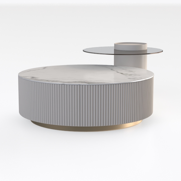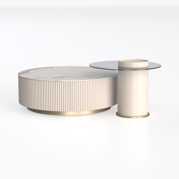 Inspired by minimalist architecture and organic marble veins, this two-piece coffee and side table set blends sleek modernity with natural elegance. The large table features a smooth marble top with striking veining, framed by crisp vertical ridges and a thin gold base for subtle luxury. The glass-topped side table, with its slender white column and matching gold base, complements seamlessly, balancing the set’s visual weight. Perfect for contemporary living rooms, it pairs beautifully with neutral sofas, soft rugs, and abstract art, offering ample surface space for decor and drinks, merging style and functionality.