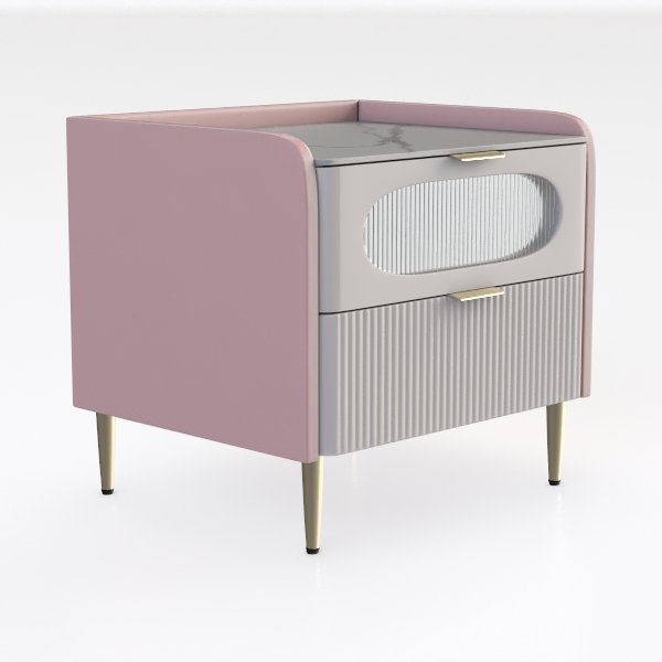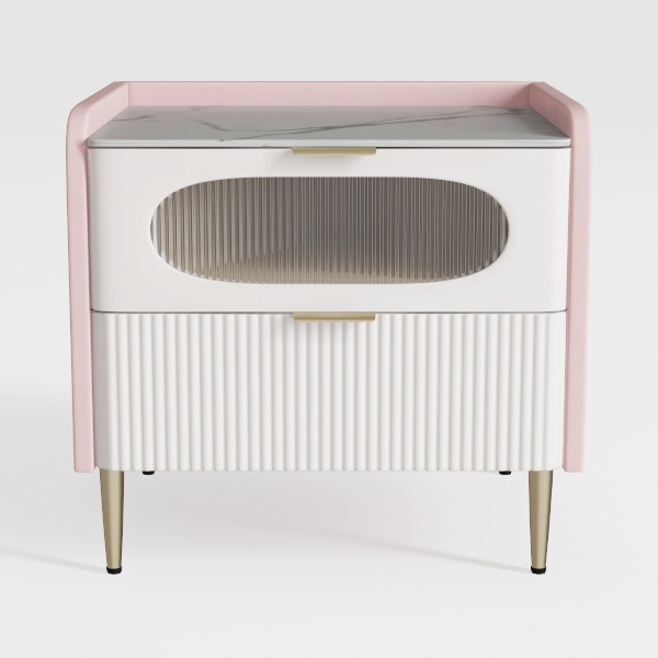 Inspired by mid-century modern charm with soft pastel accents, this piece blends a pink frame for warmth and smooth white drawers with vertical ridges. Gold metal handles and legs add sleek elegance, while the marble-like top enhances its refined appeal. Ideal for a modern minimalist or soft luxury bedroom, pairing beautifully with marble-top furniture and metallic bed frames. Two spacious drawers provide ample storage, with smooth gliding mechanisms for easy access.