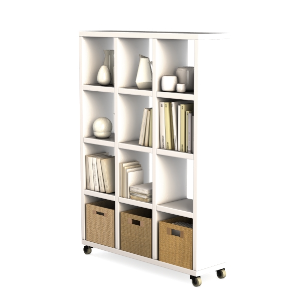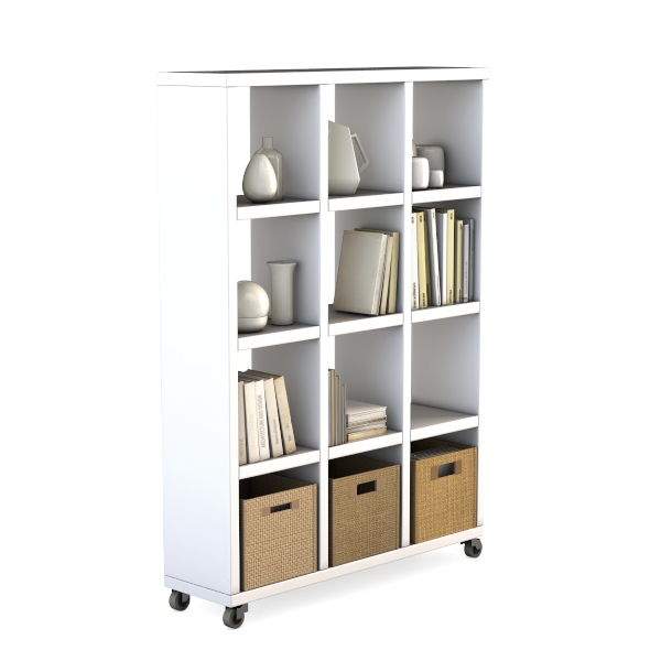 Inspired by minimalist practicality, this piece features a clean white frame with rolling casters, enabling easy repositioning. Grid compartments hold books, ceramic decor, and woven baskets, blending smooth surfaces with warm textures for an airy, balanced look. Ideal for modern or Scandinavian living rooms, pairing with neutral sofas and wooden tables, it balances storage and display through organized spaces.
