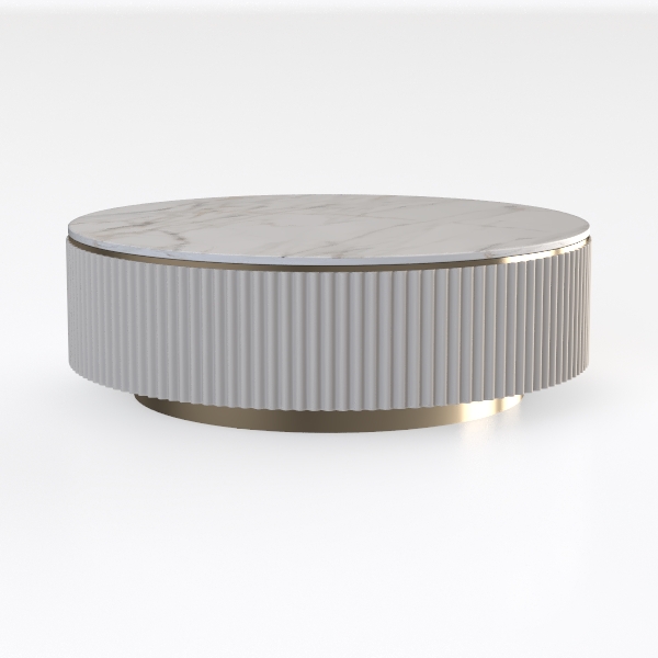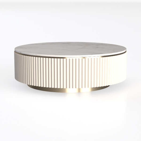 Inspired by natural marble veins and minimalist architectural lines, this piece features a smooth, warm marble top that contrasts with a crisp, ribbed white base, accented by a thin gold trim for subtle luxury. Ideal for modern minimalist or contemporary luxury living rooms, pairing beautifully with marble side tables and metallic floor lamps. Its stable base ensures durability, while the round shape softens the room’s edges, blending functionality with striking aesthetics.
