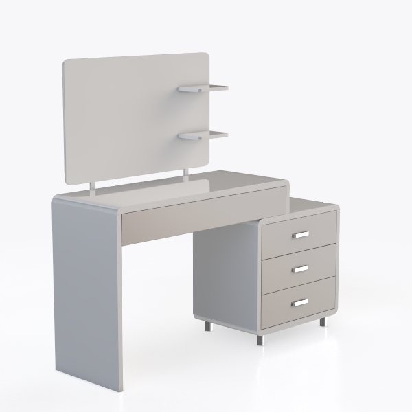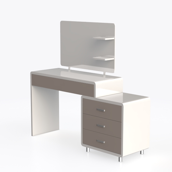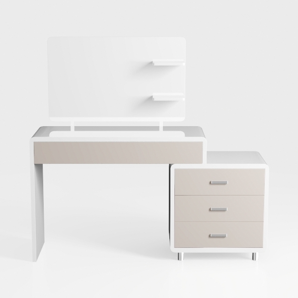 Inspired by clean architectural lines and Scandinavian minimalism, this vanity set blends simplicity with practicality. Its sleek, matte surfaces feel cool to the touch, while the crisp white and soft taupe tones create a bright, airy look. Ideal for a modern, clutter-free bedroom, pair it with soft ambient lighting and potted greenery. A spacious countertop organizes essentials, and three smooth drawers with chrome handles offer hidden storage, ensuring a tidy space.