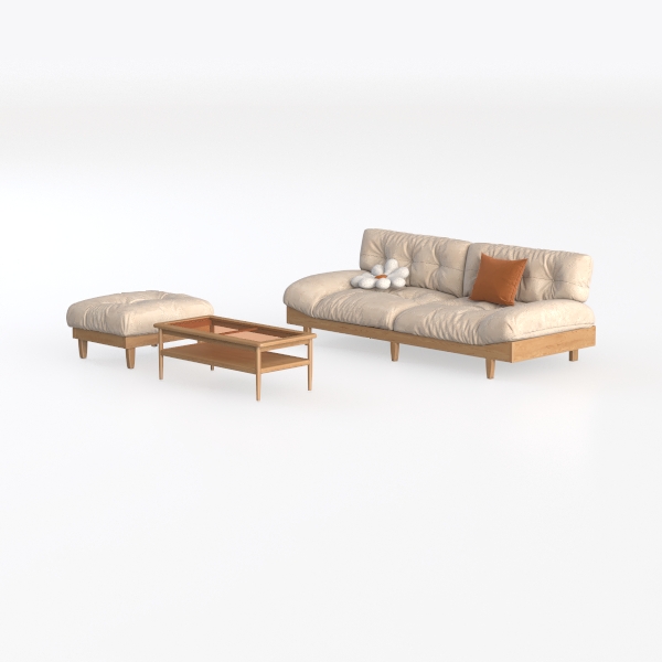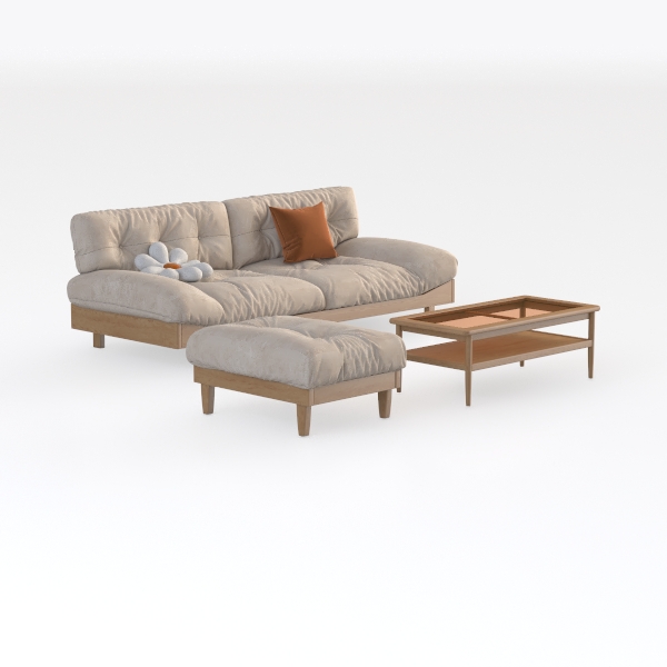 This living room set embodies a blend of minimalist design and natural warmth, inspired by the quiet beauty of unadorned spaces and tactile comfort. The design draws from the harmony of soft textiles and organic wood, aiming to create a serene yet inviting atmosphere that feels both intentional and effortless.