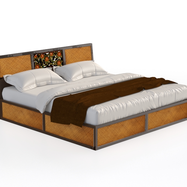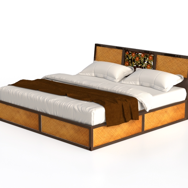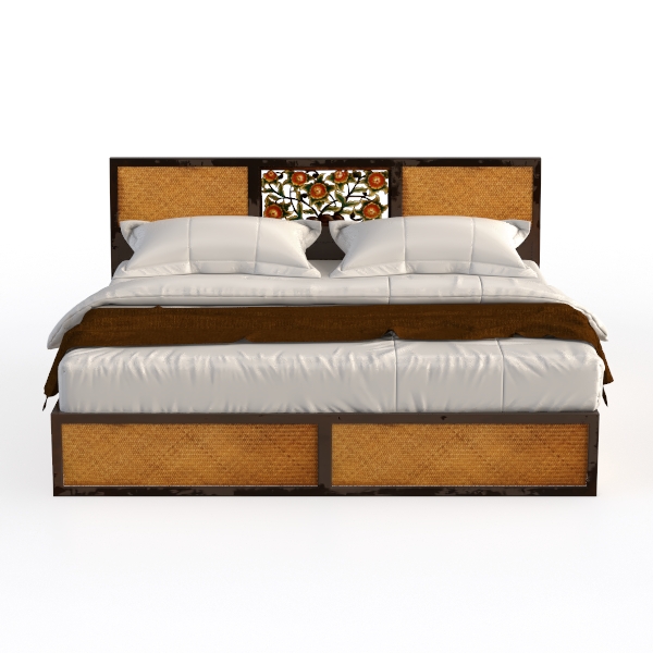 Inspired by natural materials and artisanal craftsmanship, this bed features light, airy rattan headboard and base, with an intricate floral inlay adding warm color. Its organic texture creates a serene vibe, ideal for bohemian or tropical retreats, paired with woven rugs and wooden nightstands. Spacious under-bed storage and soft linen bedding blend style and comfort.