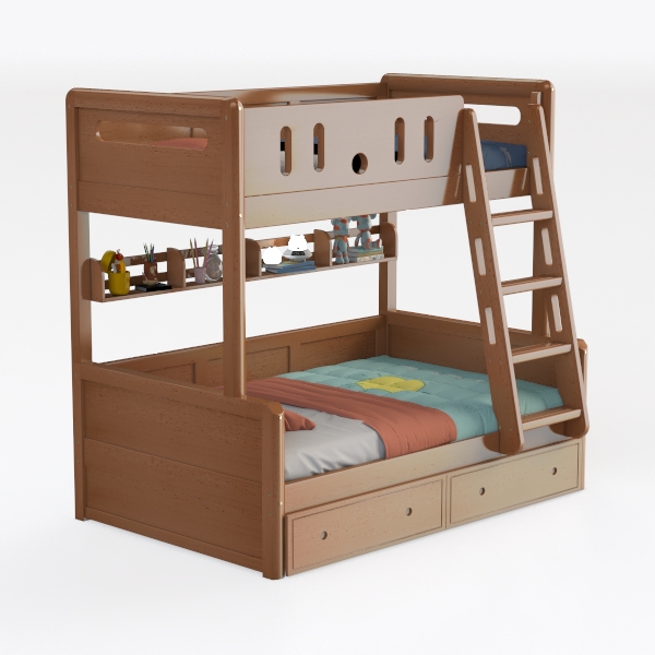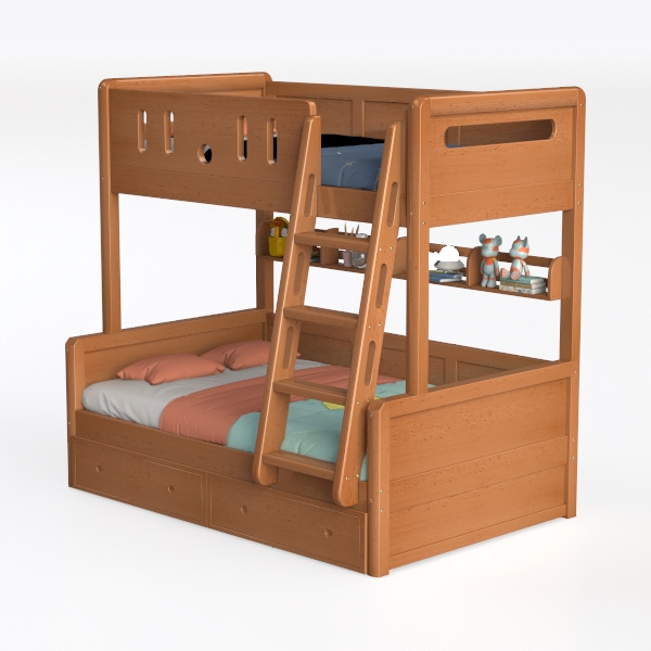 Inspired by family coziness and space efficiency, this wooden bunk bed blends practicality with warmth. The smooth, light wood texture and soft edges create a gentle, kid-friendly feel, while the light-toned frame adds a fresh, airy vibe. Perfect for child-friendly bedrooms, it pairs beautifully with playful decor like cute plush toys and soft fairy lights, enhancing a warm, minimalist Nordic style. With built-in drawers and sturdy ladders, it offers ample storage and safe access, making it ideal for small spaces and family living.