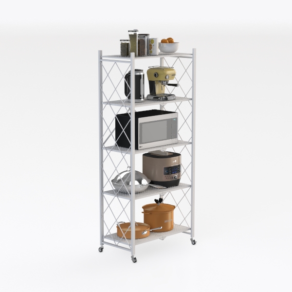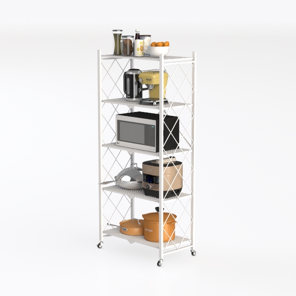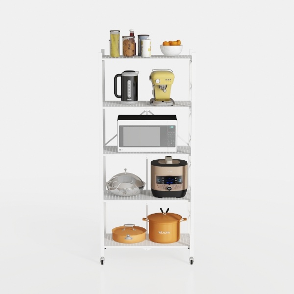 Inspired by maximizing kitchen space with a minimalist approach, this metal shelving unit features a clean white frame and sleek lines, creating a bright, uncluttered look. Sturdy yet lightweight, it holds cookware, small appliances, and pantry staples, while smooth-rolling wheels allow easy repositioning. Ideal for modern kitchens, it pairs with wooden countertops and stainless steel appliances, blending functionality with understated elegance.