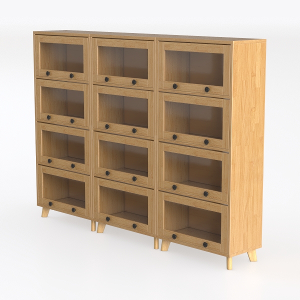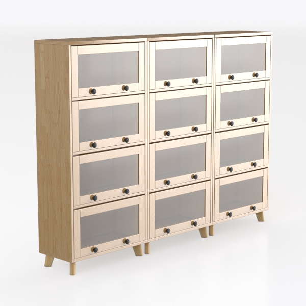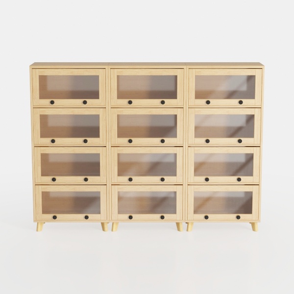 Inspired by mid-century minimalism and Scandinavian simplicity, this wooden cabinet features 9 glass-fronted drawers with sleek black knobs. Warm oak tones and smooth matte surfaces create a tactile, inviting feel, while clear panels add an airy, uncluttered look. Ideal for modern or Nordic living rooms, it pairs beautifully with light rugs and potted plants, and the tapered legs and organized storage make it both functional and stylish.