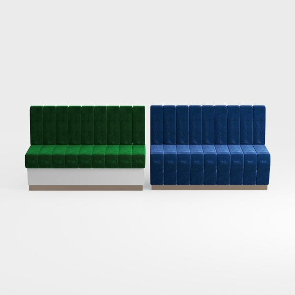 These two sofas blend geometric precision with vibrant color storytelling, inspired by mid-century modern design and abstract art. Their exterior features a rhythmic grid of staggered rectangular panels, creating a textural dance that catches light and shifts appearance slightly from different angles. The upholstery feels luxuriously soft, like crushed velvet, with a subtle sheen that enhances the rich emerald green and deep navy tones—each hue a bold yet balanced statement against the clean white base and warm taupe feet, which ground the pieces gently.