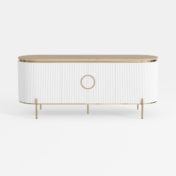 Inspired by the blend of natural wood and geometric lines, this cabinet features a smooth, crisp white surface with subtle vertical textures, paired with a warm oak top and delicate gold metal legs for a soft yet refined look. Ideal for modern minimalist or contemporary living rooms, it complements marble accents and greenery, offering spacious storage with stable, light, airy design.