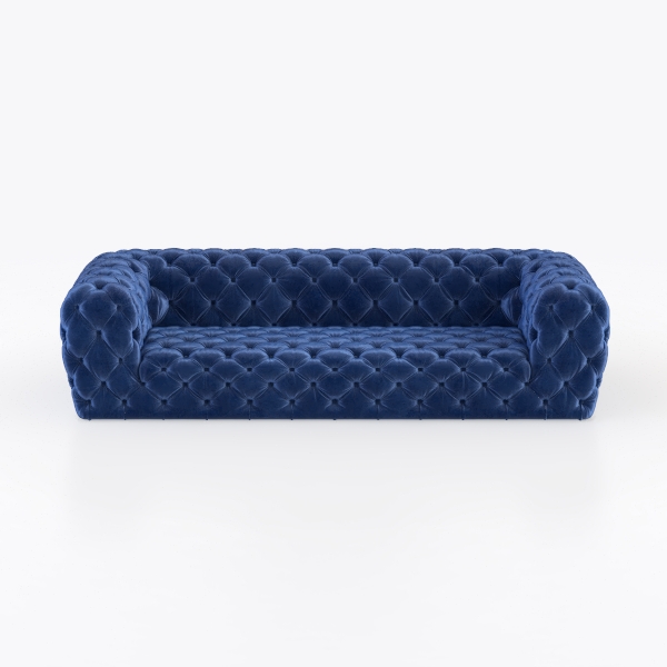 This elegant sofa merges vintage allure with contemporary grace, taking cues from mid-century modern design’s timeless appeal. Its deep, rich indigo velvet upholstery feels sumptuously soft to the touch, with a gentle sheen that warms the eye, while the iconic diamond-tufted pattern creates a three-dimensional texture—each buttoned detail rising softly, adding depth without clutter.