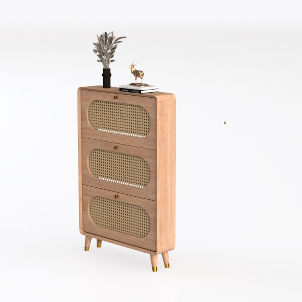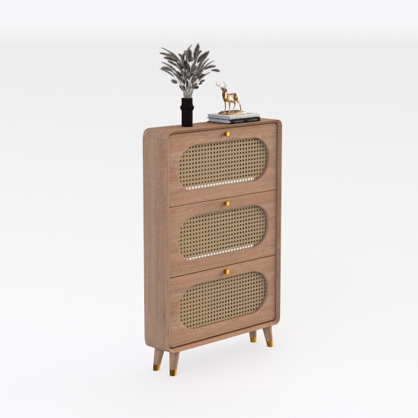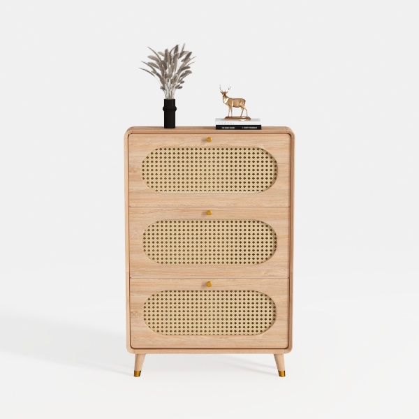 Drawing inspiration from natural textures and timeless craftsmanship, this cabinet features a warm wooden frame with delicate rattan detailing, blending soft touch and visual depth. Ideal for a cozy living room or bedroom, it pairs beautifully with minimalist sofas and potted greenery, while three roomy drawers provide ample storage, enhanced by slim golden legs for a touch of elegance and easy cleaning access.