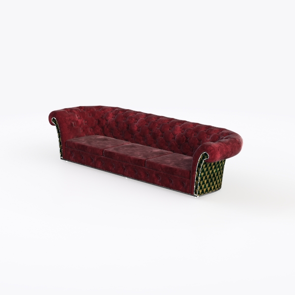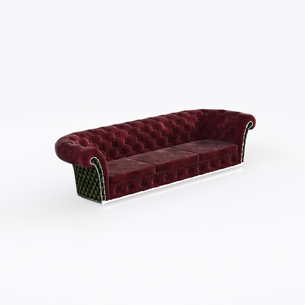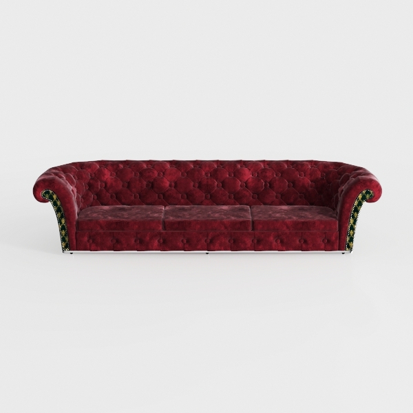 This sofa takes cues from 18th-century Chesterfield upholstery, reimagined for today’s spaces to blend timeless grace with modern personality. Its deep, velvety burgundy fabric feels surprisingly soft to the touch, with a subtle sheen that catches light, making the color pop in both warm and cool settings. The classic button-tufted pattern creates structured dimples across the back and seat, while the gently curved armrests, trimmed with polished brass nailheads, add a touch of refined detailing—balancing bold color with understated elegance.