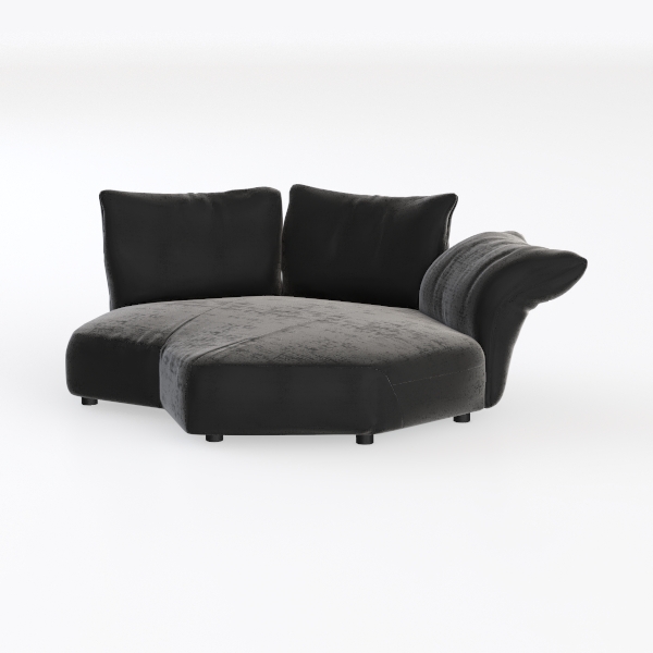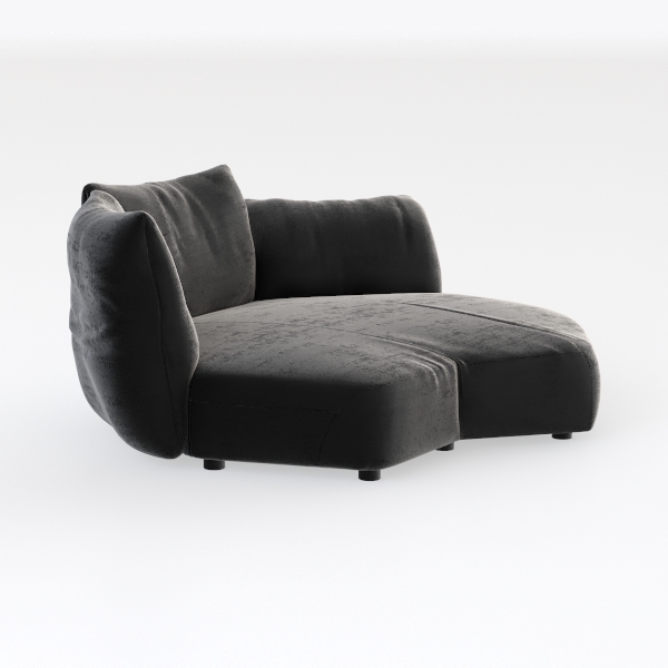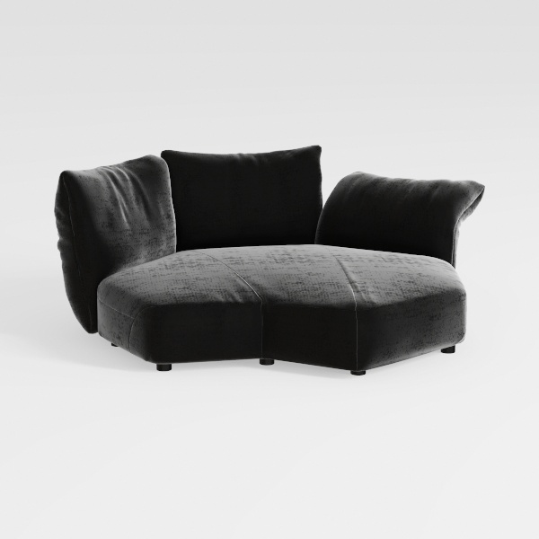 Visually, the deep, matte black hue exudes understated luxury, while the fabric’s subtle, velvety texture catches light softly, casting delicate shadows along its undulating edges. The rounded armrests and low-profile frame feel both sculptural and approachable, balancing boldness with warmth, making it a focal point that never overwhelms.