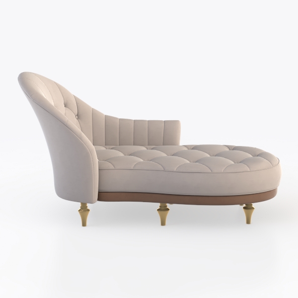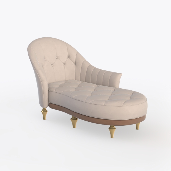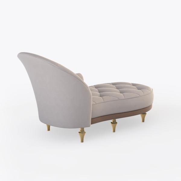 The light gray upholstery, with subtle tufted patterns and vertical channeling, creates a rich textural contrast. The fabric itself is plush and inviting, promising a cozy spot to sink into after a long day, while the curved backrest and extended chaise shape cradle the body in gentle support. Below, slender golden-tone legs and a warm brown base add a touch of opulence, balancing the softness of the upholstery with a sleek, elevated finish that catches the light beautifully.