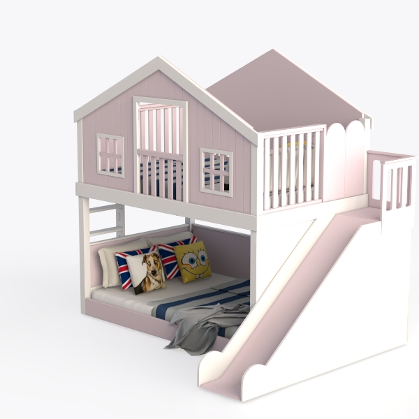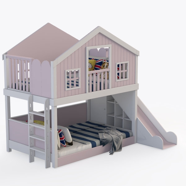Designed to evoke a cozy treehouse charm, this bed features a soft pink wooden frame with crisp white trim, creating a warm, playful look. Blue and white striped bedding adds a cheerful touch, while the built-in slide and spacious lower bed offer both fun and practicality, ideal for a little girl’s bedroom paired with soft fairy lights and plush toys.