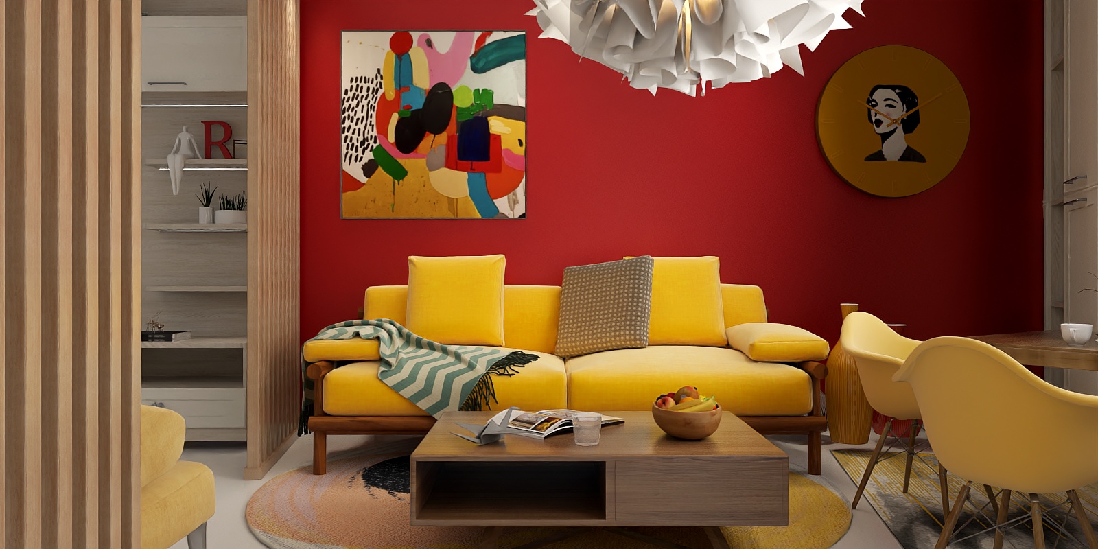 Visually, the sofa radiates warmth, its vibrant hue balancing the neutrality of a gray polka-dot cushion and a sage-and-white striped throw, creating a cohesive palette that feels both cheerful and calm. The open frame design, with its thin, polished legs, keeps the space airy, making it ideal for both compact apartments and larger living areas.
