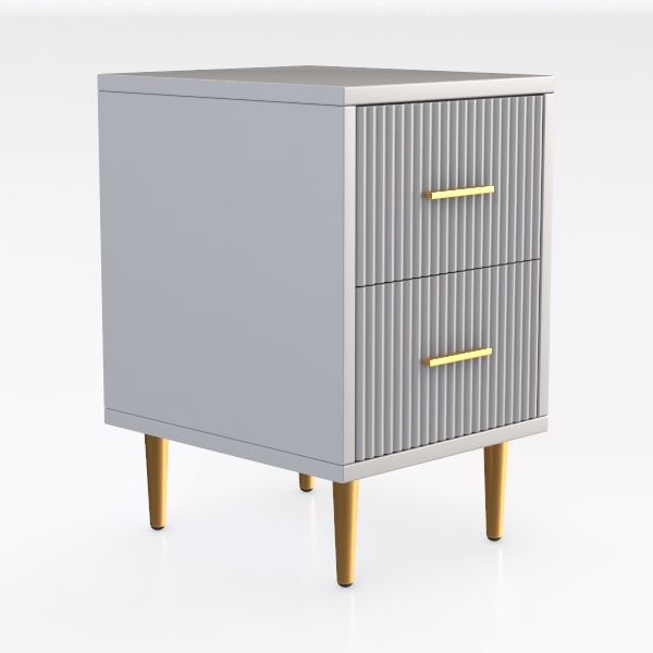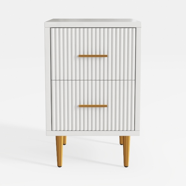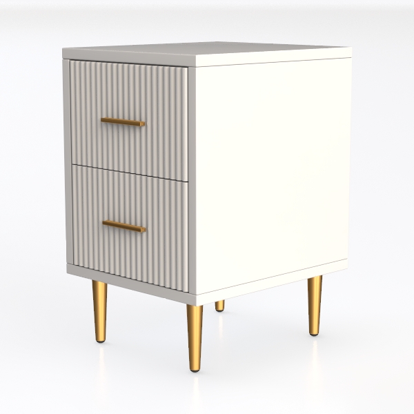 Inspired by classic geometric lines and modern minimalism, this nightstand features a textured white surface with vertical ridges, complemented by elegant golden handles and slender golden legs. It blends sleek aesthetics with practicality, offering two drawers for organized storage of bedtime essentials. Perfect for a modern-luxury or Scandinavian-style bedroom, it pairs beautifully with light gray walls and wooden flooring, enhancing the room's warm, refined vibe.