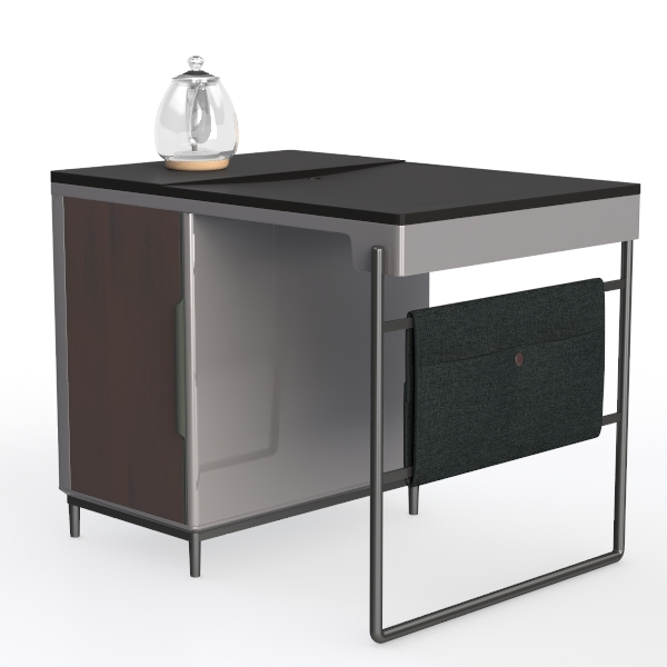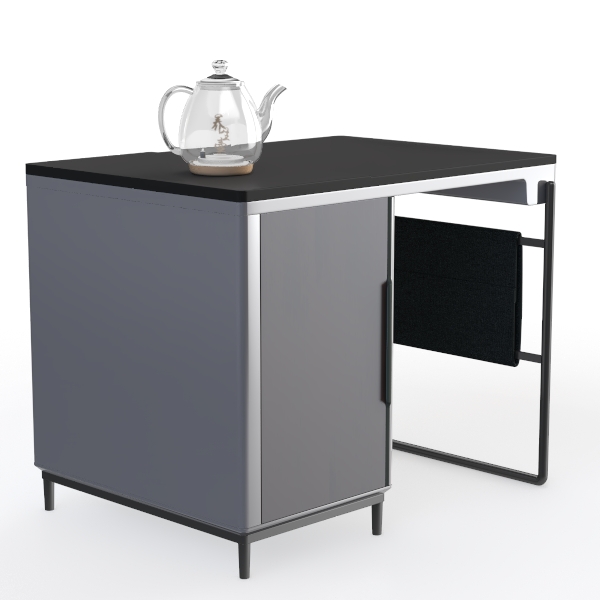 Inspired by urban minimalism, this piece merges sleek lines with functional charm. A smooth matte black top contrasts with warm wood-grained cabinetry, while slim metal legs add subtle industrial edge. Ideal for a minimalist home office or cozy living room nook, pairing with marble accents and soft textiles. A hidden cabinet offers neat storage, keeping essentials organized, and the elevated design maximizes floor space.
