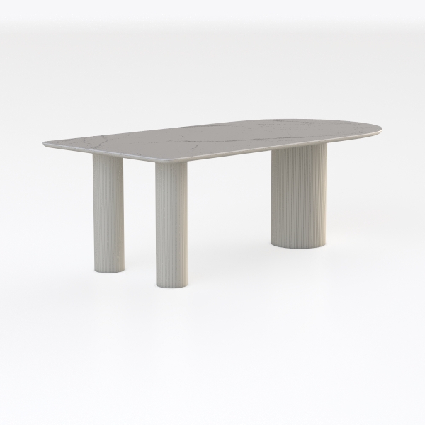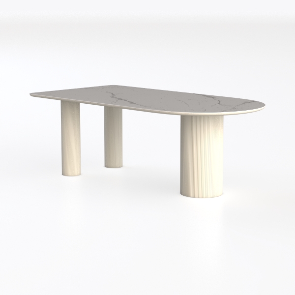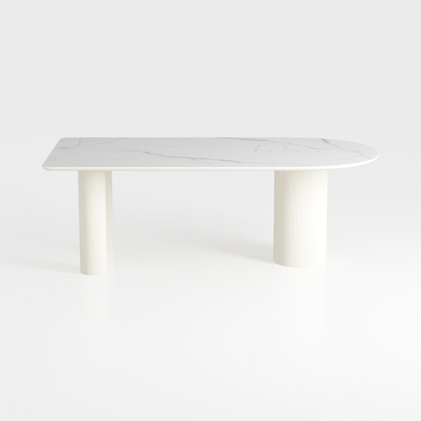 Inspired by minimalist nature, this table blends organic softness with crisp lines, featuring a sleek, polished marble top with natural veining and tactile ribbed white legs. Its calm visual contrasts with textural richness, ideal for modern minimalist or contemporary spaces. Pair with light sofas and metallic accents; spacious top offers ample room, sturdy legs ensure stability, merging serene aesthetics with practical functionality.