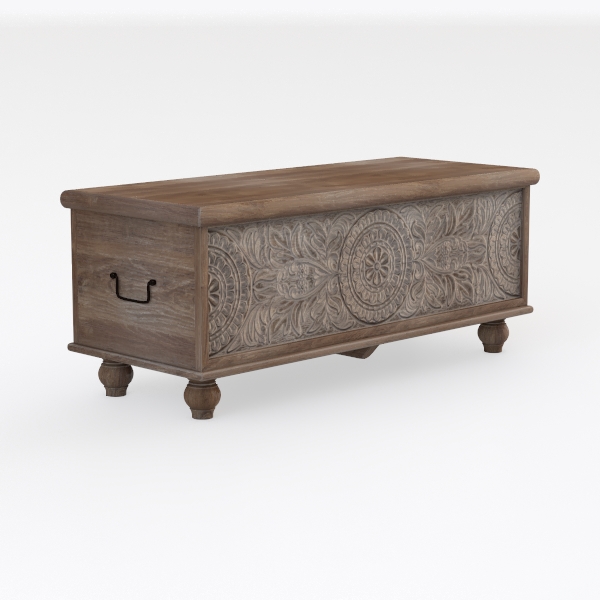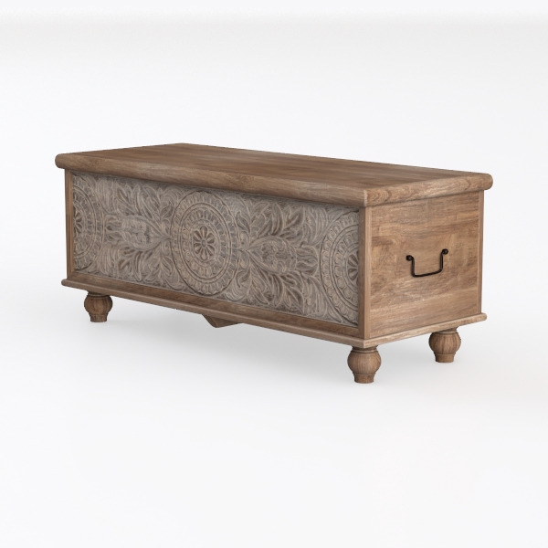 Inspired by traditional craftsmanship, this cabinet blends floral motifs and geometric patterns for timeless charm. Its warm, weathered wood tones and intricate carved details create tactile richness, with soft edges enhancing a cozy vibe. Ideal for bohemian or vintage living rooms, pair it with woven rugs and potted greenery. Ample storage, sturdy frame, and turned legs add utility, making it a functional, decorative centerpiece.
