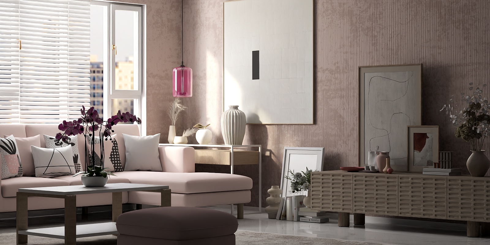 Inspired by the soft pastels of dawn and the uncluttered charm of Scandinavian design, this L-shaped sofa marries comfort with gentle sophistication. Its light pink upholstery, crafted from a buttery-soft, textured fabric, feels delightfully warm to the touch—like resting on a cloud of cozy luxury. The neutral-toned cushions, dotted with geometric patterns, leafy prints, and soft grays, add playful contrast, balancing the sofa’s sweet hue without overwhelming the space.