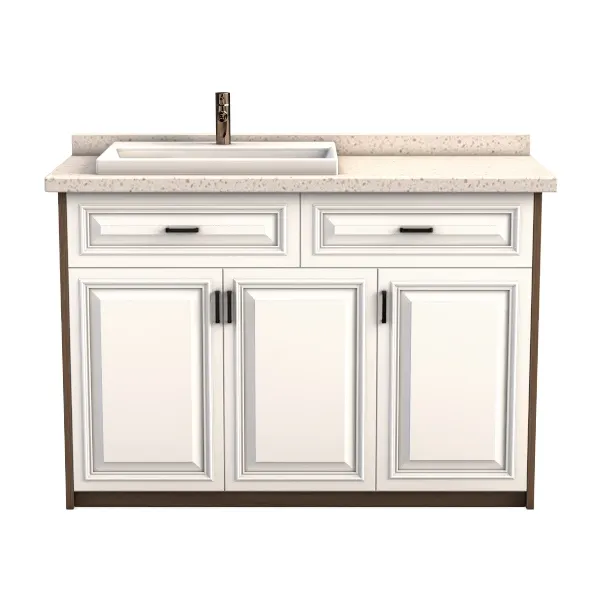 A 3D model of a Bathroom Cabinet Set, featuring white cabinetry with speckled marble countertop, drawers/doors with metal handles, and a modern classic aesthetic. It has low polygon count and detailed textures, suitable for bathroom decor and interior design projects.