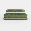 Designed with organic minimalism in mind, this piece draws inspiration from nature’s softest elements, with a gently curved headboard mimicking the relaxed lines of a cloud or rolled linen, infusing the space with quiet calm. The headboard features a textured, linen-like fabric in a warm taupe hue—its soft, slightly fuzzy surface invites gentle touches, feeling both durable and unexpectedly cozy. Draped over a crisp white linen base, a vibrant emerald green duvet adds a fresh, nature-inspired contrast, while the smooth, matte black frame grounds the design, balancing softness above with sleek modernity.