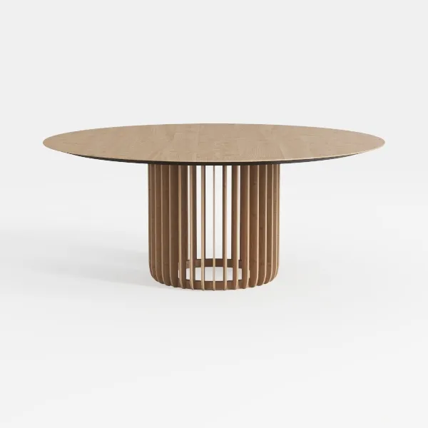 Inspired by organic forms and geometric precision, this table features a warm oak surface with smooth, tactile texture, complemented by slender vertical slats that create visual lightness. Perfect for minimalist dining spaces or cozy living rooms, pairing beautifully with linen upholstery and marble accents. Sturdy base ensures stability, while the generous circular top offers ample space for dining or working.