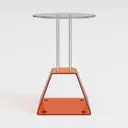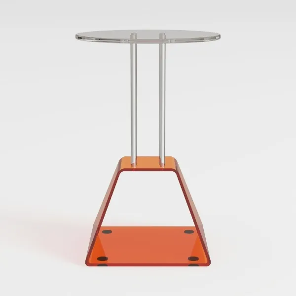 This elegant side table blends geometric precision with warm minimalism, drawing inspiration from mid-century modern design principles and abstract art. Its circular top, crafted from clear, high-quality glass, exudes a sense of lightness, while two slender, polished chrome legs rise vertically, adding a touch of industrial cool. The base, however, steals the spotlight: a vibrant tangerine acrylic structure, shaped into a bold triangular form, provides a striking contrast to the glass and metal elements. The acrylic’s semi-translucent quality softens the orange hue, casting subtle, warm reflections across surfaces.
