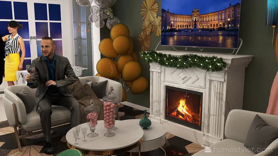 Una fiesta de fin de año, una casa pequeña, pero llena de alegría y amigos. Tal vez la decoración no sea la más ostentosa ni la más brillante, pero el ambiente es de fiesta total. Se trata de un salón con terraza, con una barra para servir copas, unos globos y una mesa con comida y bebidas.
