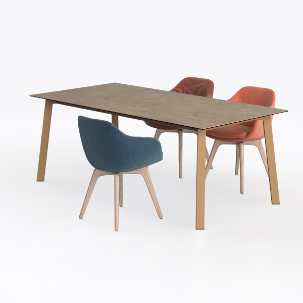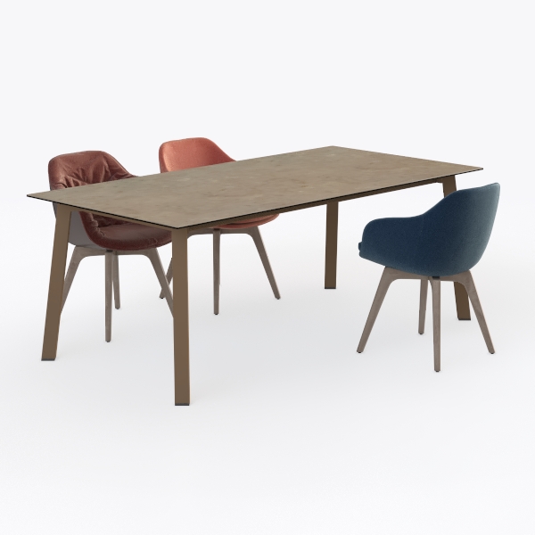 The chairs complement this with their plush, upholstered seats and backs, wrapped in rich, velvety fabrics—deep rust, soft tangerine, and muted blue—that add a tactile contrast to the table’s smooth surface. Each chair is designed with gentle curves: a slightly raised seat and a contoured backrest that cradles the body, offering both style and comfort for extended use.