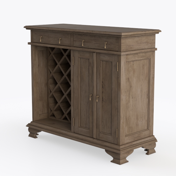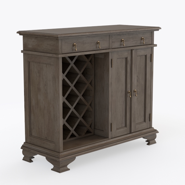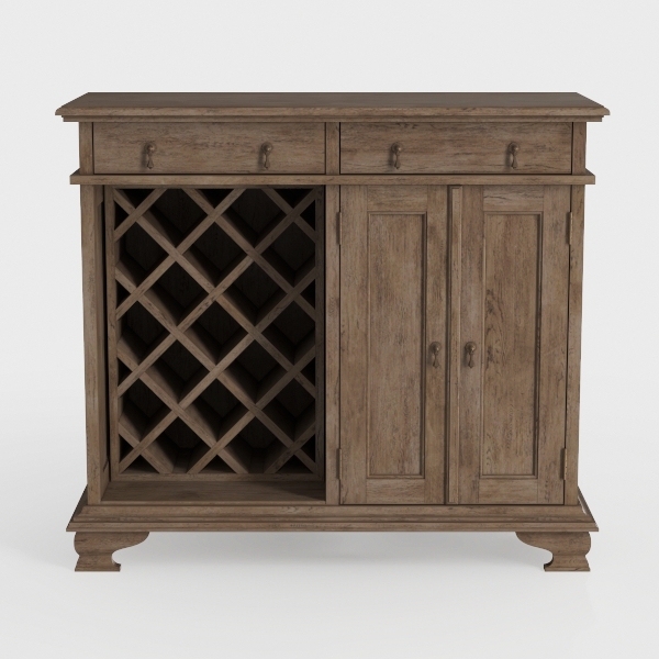 Functionality meets form here: the top drawers offer compact storage for bar tools and wine accessories, while the wine rack, with its staggered compartments, keeps bottles organized and easily accessible. The closed cabinets below provide space for bulkier items or display, ensuring the piece serves both practical and decorative roles. Whether hosting a wine tasting or simply adding character to a room, this cabinet is a harmonious blend of beauty and utility.