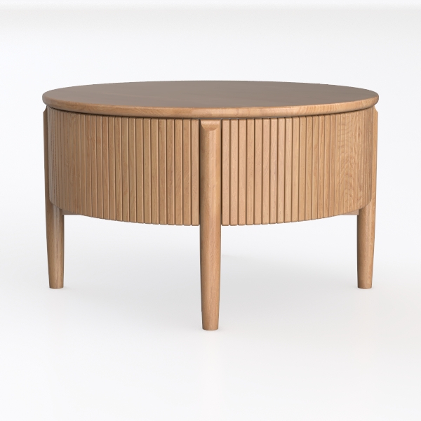 This elegant table draws inspiration from the quiet harmony of natural wood and geometric precision, blending organic warmth with structured simplicity. Crafted from solid oak, its surface is meticulously sanded to reveal soft, flowing wood grain patterns—horizontal on the tabletop, vertical on the sides—creating a tactile, textural depth that feels both handcrafted and refined. The light oak hue radiates calm, while the vertical fluting catches light gently, casting subtle shadows that animate the space without harshness, making it feel open and inviting.