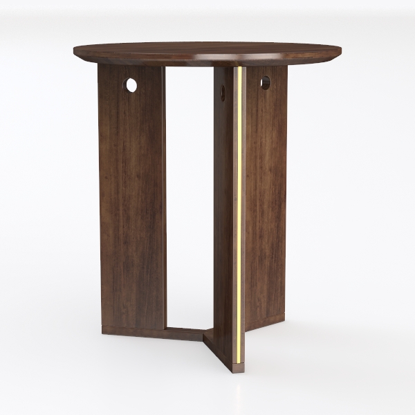 The tabletop, a smooth, circular expanse, boasts a rich, honeyed-brown hue with intricate, natural wood grain patterns that dance across its surface—each line and knot telling a story of the material’s origin. The wood feels cool yet inviting to the touch, with a subtly sanded finish that adds softness without losing the material’s inherent texture. Supporting the top are two slender, vertical side panels, their edges gently angled to create a light, open silhouette, while small, circular cutouts near the top add a playful, airy detail that breaks up the solidity of the wood.