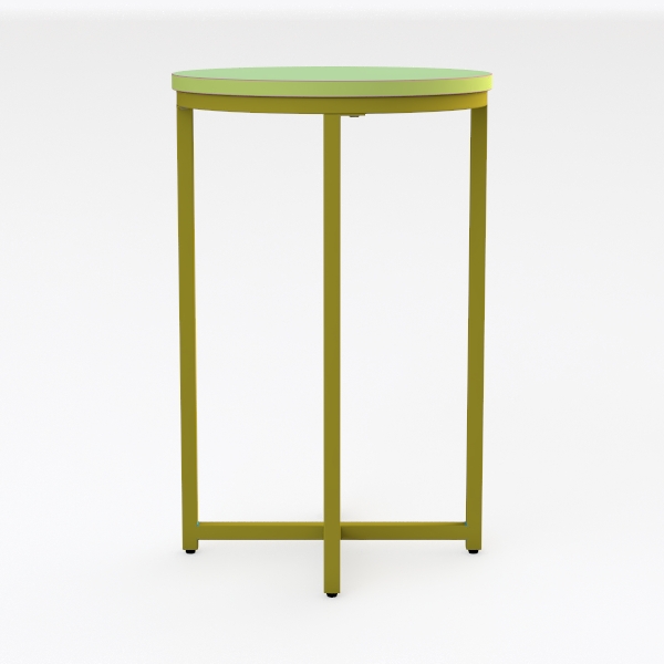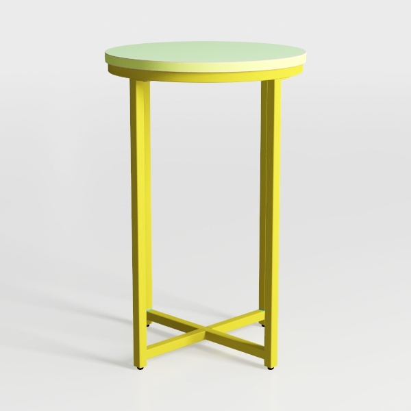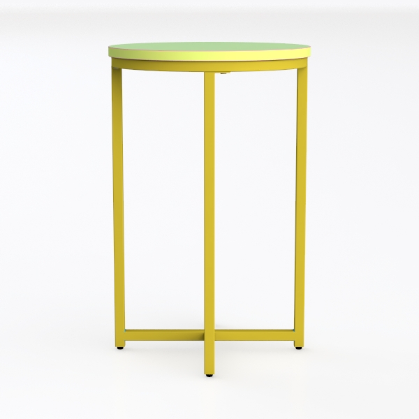 Crafted with balanced minimalism, this side table draws inspiration from the harmony of geometric structure and organic softness. The smooth, matte sage green tabletop contrasts gently with the warm canary yellow powder-coated metal frame, creating a fresh yet vibrant aesthetic. Its slender, tapering legs and angled crossbar base add structural interest while keeping the piece light and unobtrusive, making it visually open and stable.
