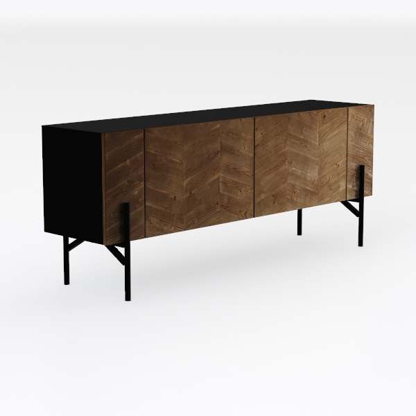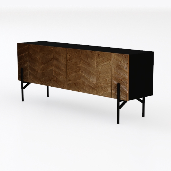 This elegant sideboard draws inspiration from the organic symmetry of natural wood grain and mid-century modern design principles, merging timeless craftsmanship with contemporary simplicity. The warm, earthy tones of the wood—rich chestnut and soft oak—create a cozy yet sophisticated vibe. The intricate herringbone pattern in the cabinet doors adds subtle visual interest, with each plank’s grain standing out against the smooth, matte finish, inviting gentle touches that reveal the material’s natural warmth. Contrasting sharply, the black marble-like top and slender black metal legs introduce a modern edge, balancing the organic softness of the wood with industrial minimalism.