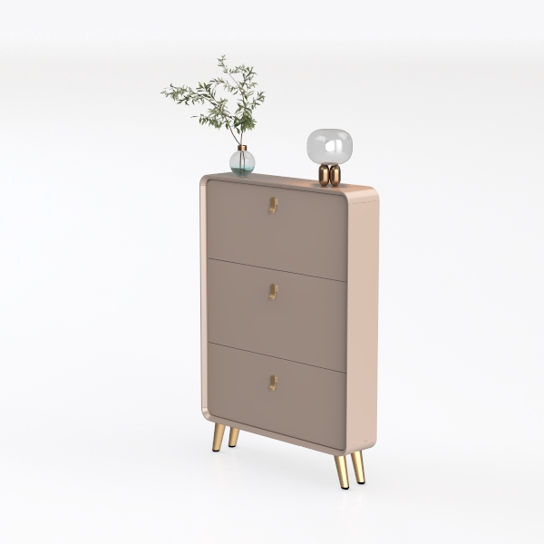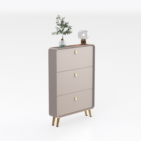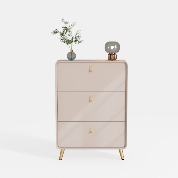 A sleek, three-drawer cabinet with a soft, off-white finish, its clean lines and minimalist silhouette catching the eye. Drawing inspiration from mid-century modern design, it merges timeless simplicity with subtle elegance, balancing soft, flowing contours with structured elements. The off-white surface, with a smooth, matte texture, feels cool and delicate to the touch, while the warm gold hardware of the drawer pulls adds a touch of understated luxury, reflecting light gently. Its slender, tapering legs elevate the piece, creating an airy, lightweight presence that works seamlessly in small or large spaces.