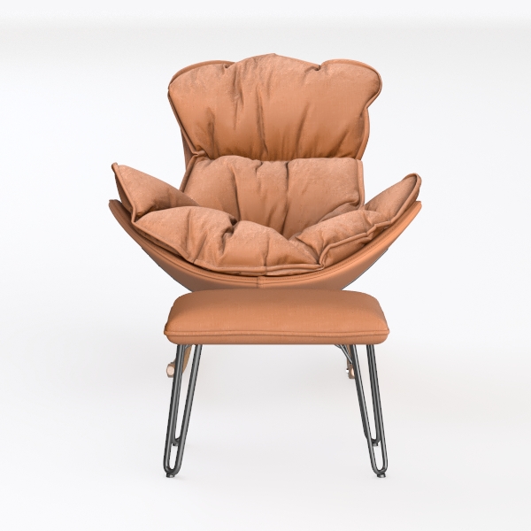 Crafted with inspiration from organic, flowing shapes like polished river stones or curved seed pods, this lounge set merges softness with subtle structure. The main chair boasts a warm, terracotta-hued upholstery that feels surprisingly inviting—its textured, velvety surface yields gently to the touch, while the contoured back and generously padded seat cradle the body in plush comfort. Contrasting with the chair’s rounded, cocoon-like form, the black metal frame, with its delicate, geometric legs, adds a modern, airy lightness, while the light oak wooden rocking base ensures smooth, soothing motion with every gentle sway.
