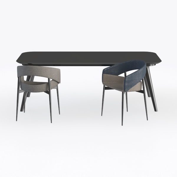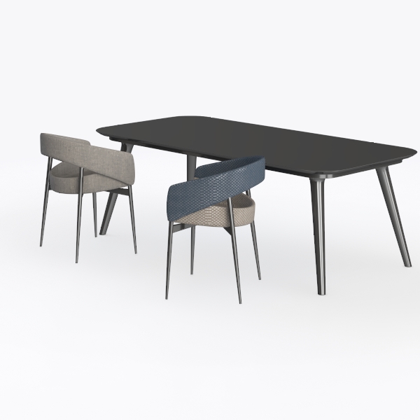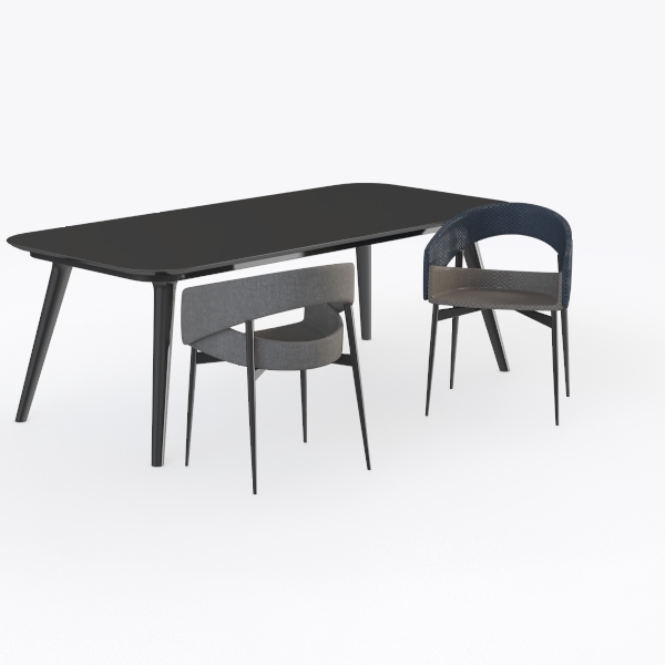 Crafted with a focus on architectural minimalism, this furniture set draws inspiration from the clean lines and geometric precision of modernist design, balancing functional utility with subtle sculptural charm. The tabletop, with its smooth, matte black surface—likely a high-quality stone or engineered material—exudes a sense of calm and sophistication, while its angular edges contrast gently with the soft, flowing lines of the chairs.