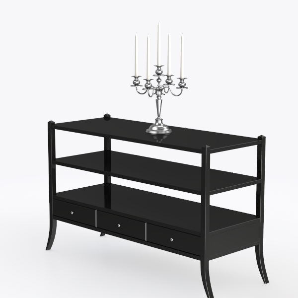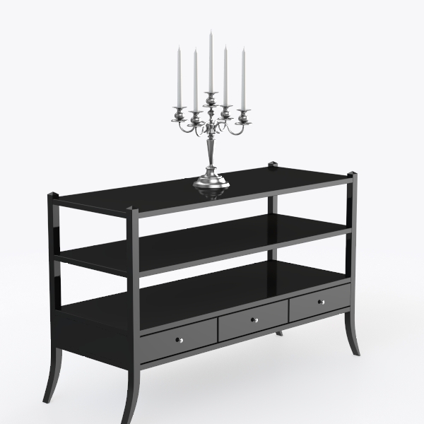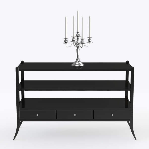 The smooth matte black surface feels cool and tactile, with a subtle sheen that softens light gently, while the slender, tapering metal legs—finished in a warm silver—provide stability without bulk, creating an airy, uncluttered look. The contrast between the rich black and the polished silver candelabra (as seen on top) adds a striking focal point, balancing boldness with refinement.