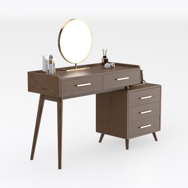 Ideal for a modern bedroom or a minimalist dressing area, it pairs beautifully with soft linen bed linens, a small potted succulent, and a marble-topped nightstand, enhancing the space’s warm, inviting atmosphere. The main drawer offers ample room for larger essentials, while the slim, side cabinet with three smaller drawers keeps smaller items—like jewelry, lipsticks, or hair accessories—neatly organized. Its tapered, angular legs add a light, airy feel, making it both functional and visually balanced, perfect for those seeking a blend of style and practicality in their daily routine.