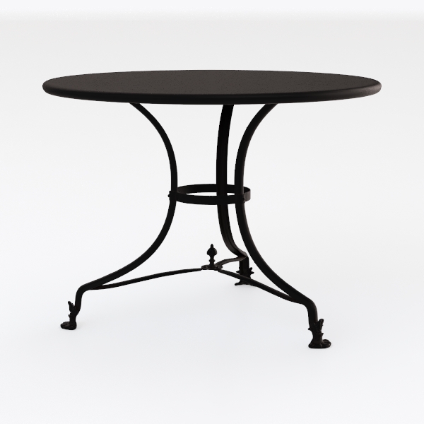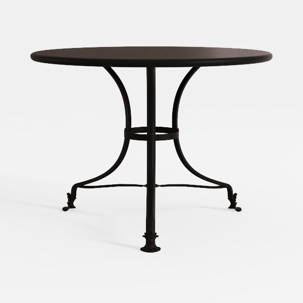 Drawing inspiration from 19th-century forged ironwork, this piece marries traditional artisanal details with contemporary minimalism. The circular tabletop, rendered in a rich, warm-toned material—likely polished wood or a high-quality composite—boasts a smooth, slightly textured surface that invites gentle touch, its matte finish catching light softly to reveal subtle grain patterns. Contrasting sharply, the frame is crafted from matte black metal, with tapering, curved legs that rise from a central circular support, creating a visually balanced, almost floating effect.