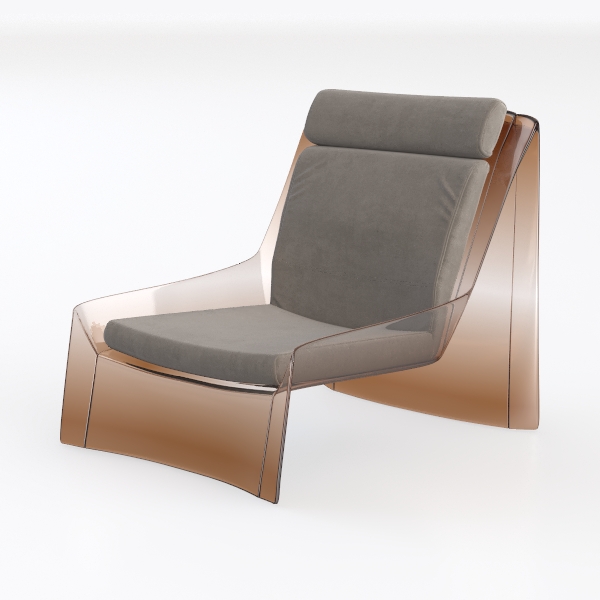 Crafted with a translucent, gradient amber frame, it shimmers subtly under light, its smooth, polished surface creating a sense of weightlessness that contrasts beautifully with the chair’s plush upholstery. The seat and backrest are wrapped in a warm, light gray fabric, soft to the touch and inviting for long hours of relaxation, while the gentle give of the cushions ensures a cozy, supportive fit.