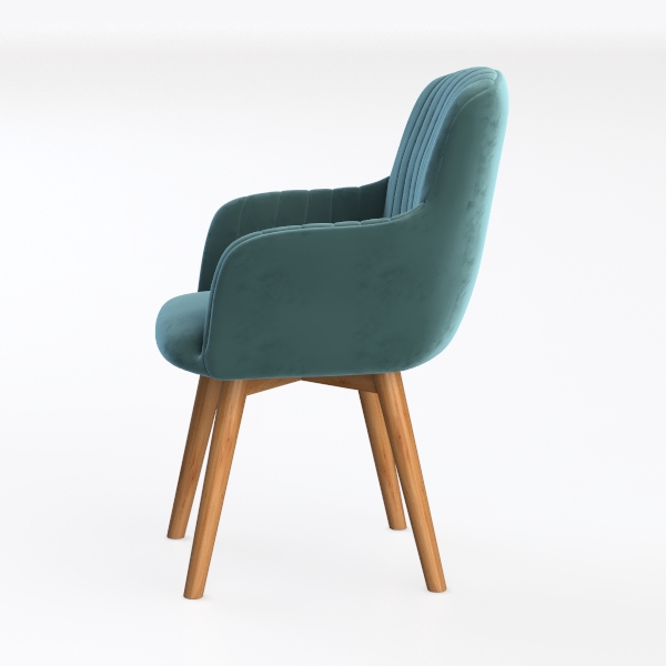 The chair’s most striking feature is its velvety upholstery—luxuriously soft to the touch, with a subtle luster that catches light gently, creating a tactile experience that feels both indulgent and inviting. Vertical channeling along the back and seat adds visual rhythm, elongating the silhouette and enhancing its structural grace, while the light oak legs, slender yet sturdy, ground the piece with a natural warmth that contrasts beautifully with the vibrant upholstery.