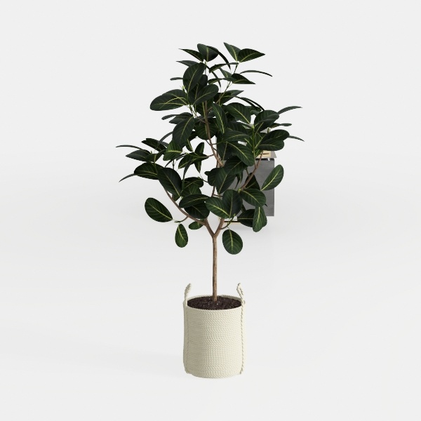 The plant’s most striking feature is its foliage: broad, elliptical leaves in a rich, deep emerald green, streaked with delicate golden-yellow veins that catch the light like scattered sunshine. The leaves have a smooth, slightly waxy texture, their surfaces glistening softly under overhead lighting, while the branches grow in a balanced, tiered pattern—arcing gently to form a full, rounded canopy that feels both lush and intentional, never cluttered. Planted in a textured, off-white woven basket, crafted from soft, natural fibers with a loose, artisanal weave, the contrast between the structured, glossy leaves and the warm, handcrafted basket adds tactile depth, balancing modern simplicity with organic warmth.
