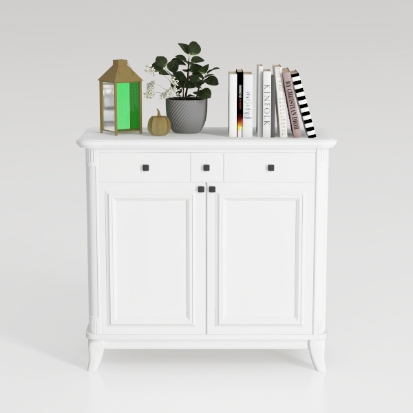 Crafted with a smooth, matte finish, the cabinet’s surface feels cool yet warm to the touch—fine-grained and slightly resistant to fingerprints, making it easy to maintain. Visually, the crisp white hue reflects light, creating an airy, spacious feel in any room. On top, a green lantern, potted plant, and stacked books add layers of color and organic life, softening the cabinet’s structured design into something inviting and lived-in.