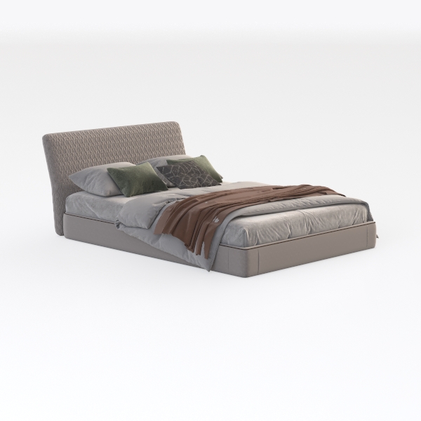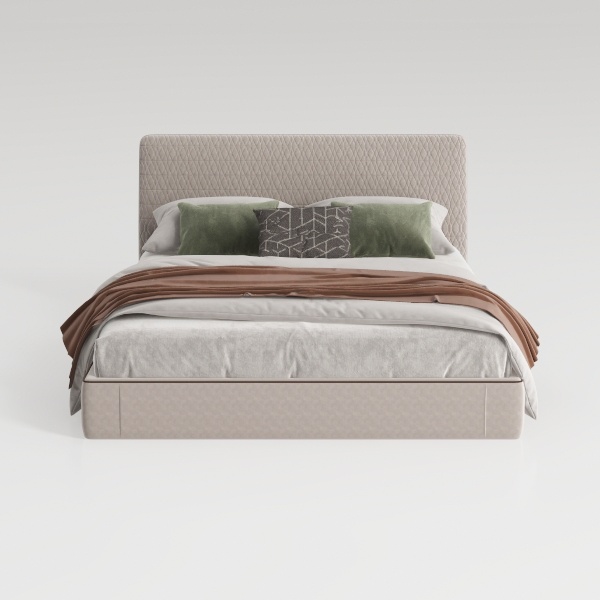 This furniture piece merges modern elegance with practical comfort, inspired by the pursuit of a serene, clutter-free sleep environment. The headboard, upholstered in soft, textured fabric with a subtle diamond pattern, adds visual depth without overwhelming the space, while its neutral gray hue creates a calming backdrop. The bed’s frame, crafted with clean lines and a smooth finish, complements the upholstery, enhancing the overall sense of simplicity.